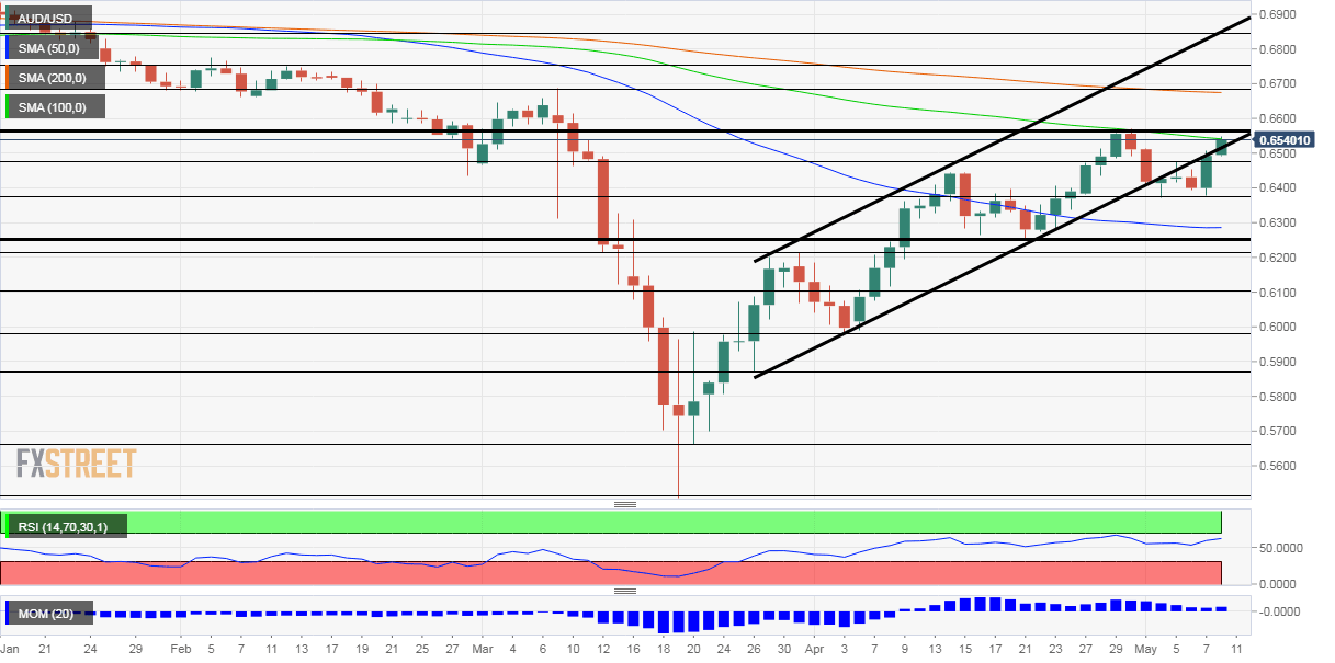 - AUD/USD has held up yet failed to reach new highs amid global concerns.