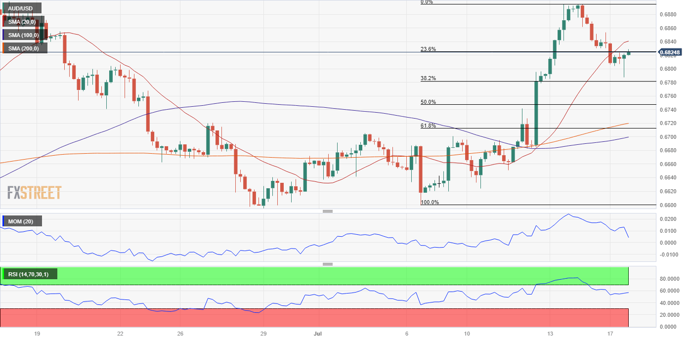 The AUD/USD pair bounced from the aforementioned intraday low and trades in the 0.6820 price zone. The daily chart shows that AUD/USD flirted with the 38.2% Fibonacci retracement of its 0.6598/0.6894 rally at 0.6780 and currently hovers around the 23.6% retracement of the same run. Meanwhile, technical indicators remain directionless in the 0.6680/0.6720 price zone, suggesting bulls retain control. Finally, technical indicators offer modest bearish slopes but remain well into positive ground, limiting chances of a stepper decline, particularly if the aforementioned Fibonacci level holds.