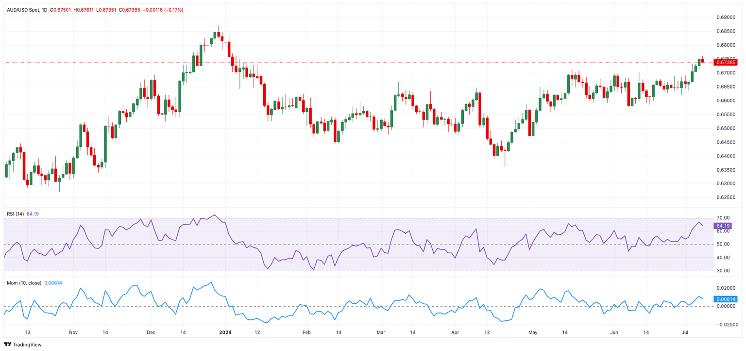 If bulls push harder and AUD/USD clears the July high of 0.6761 (July 8), it may then challenge the December 2023 top of 0.6871, before the July 2023 peak of 0.6894 (July 14), all ahead of the critical 0.7000 barrier.