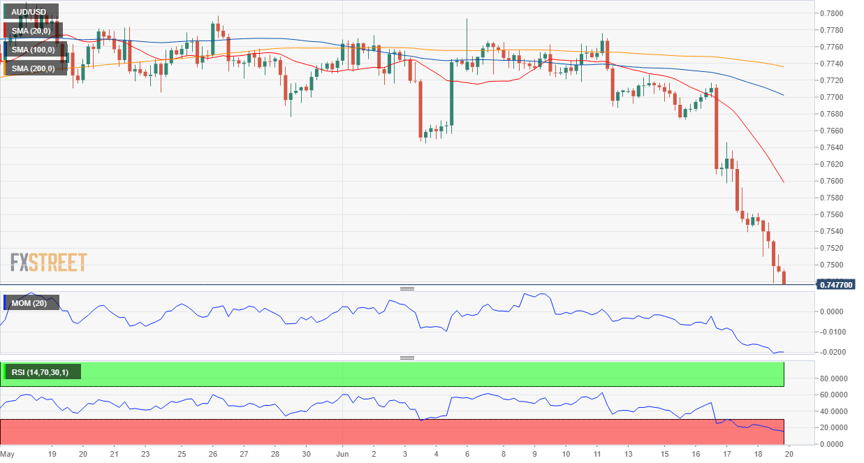 The AUD/USD pair daily chart shows that the pair has broken below all of its moving averages, accelerating its decline after piercing the 200 SMA, now providing dynamic resistance around 0.7550. In the meantime, technical indicators head firmly south despite developing in oversold readings, without signs of bearish exhaustion. The picture is quite alike in the 4-hour chart, with technical indicators heading lower in extreme oversold readings, as the pair develops far below bearish moving averages.