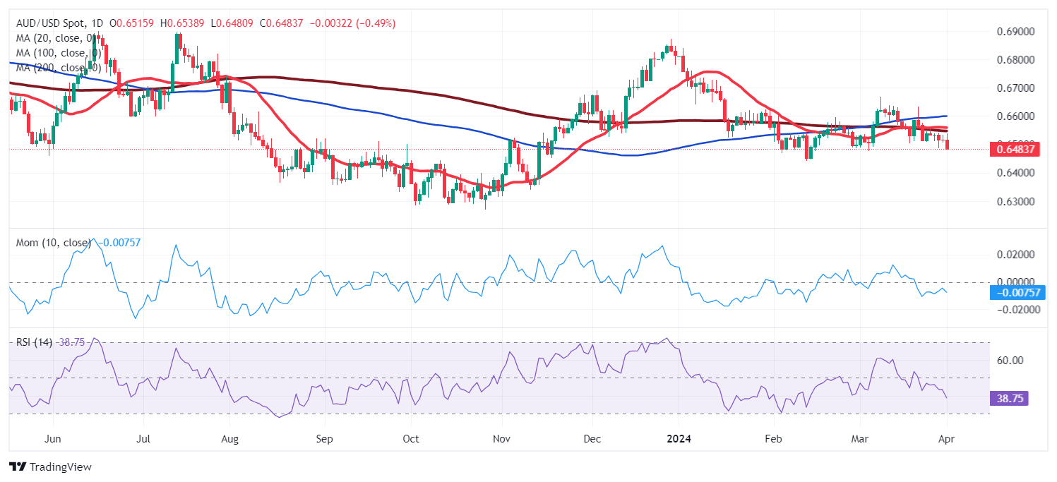 The AUD/USD pair trades around 0.6480, and the daily chart shows bears are in full control. The pair develops below all its moving averages, with the 200 Simple Moving Average (SMA) heading south below directionless shorter ones. At the same time, technical indicators gain downward momentum within negative levels, in line with another leg south towards 0.6441, the year's low.