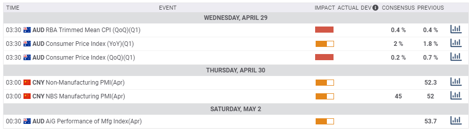 The Aussie, a "risk" currency, traded between optimism and pessimism, driven by volatile oil prices. The commodity-exporting nation also received a mixed dose of data, and now it faces quarterly inflation figures. Top-tier US events and Chinese statistics are also in the mix as April draws to a close.