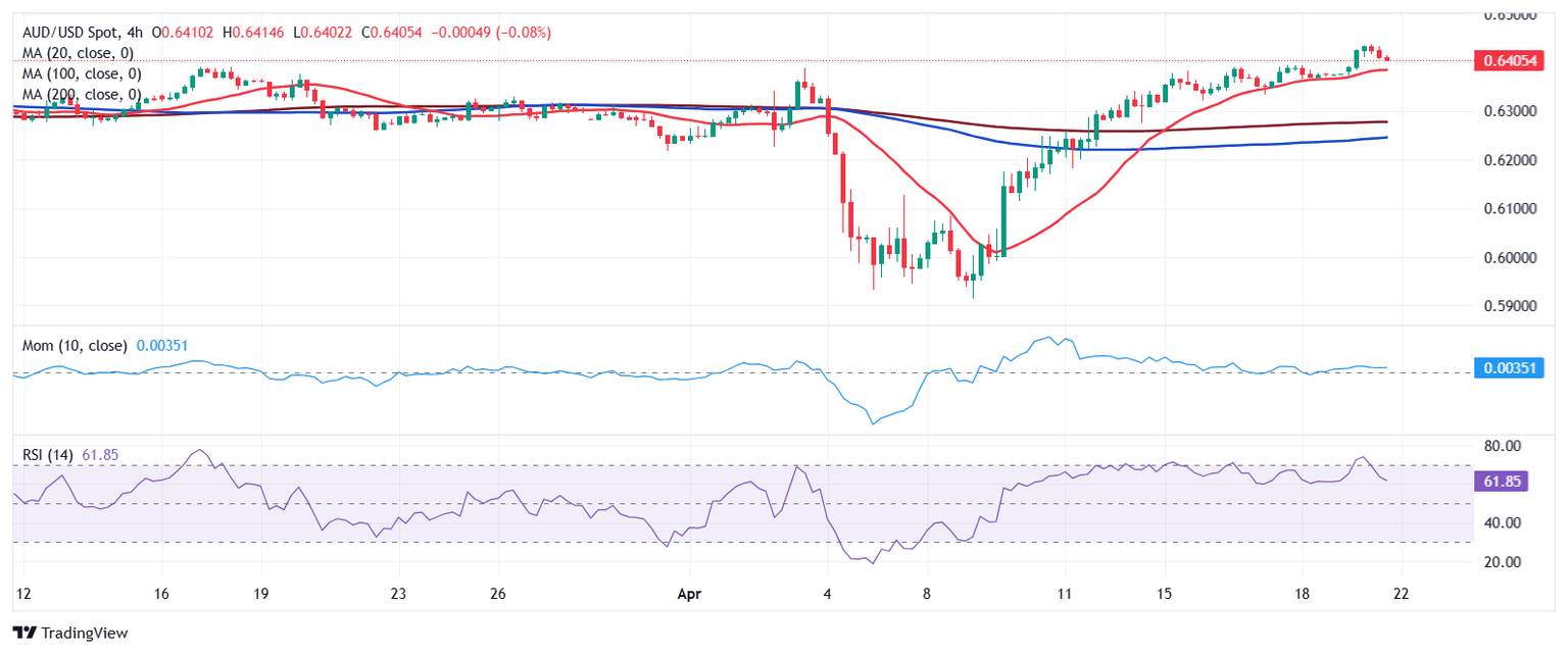 The AUD/USD pair trades just above 0.6400 ahead of the Asian opening, up for a ninth consecutive day. Technical readings in the daily chart suggest the positive momentum eases, but the risk remains skewed to the upside, given that technical indicators develop well above their midlines, despite losing their upward strength. The same chart shows AUD/USD develops above its 20 and 100 Simple Moving Averages (SMAs), while a mildly bearish 200 SMA provides dynamic resistance at around 0.6470.