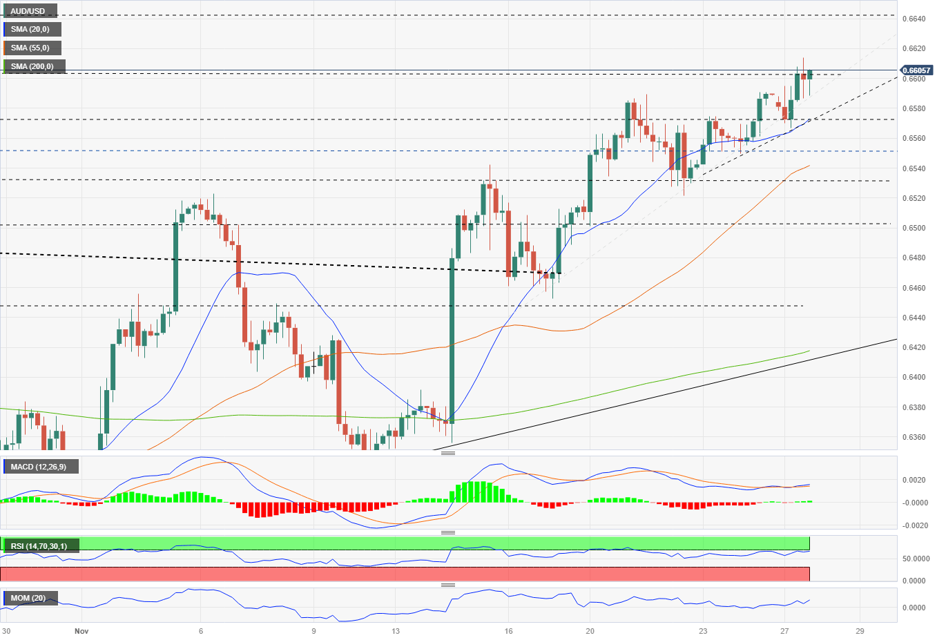 - The AUD/USD is testing levels above the 200-day SMA and the 0.6600 mark.