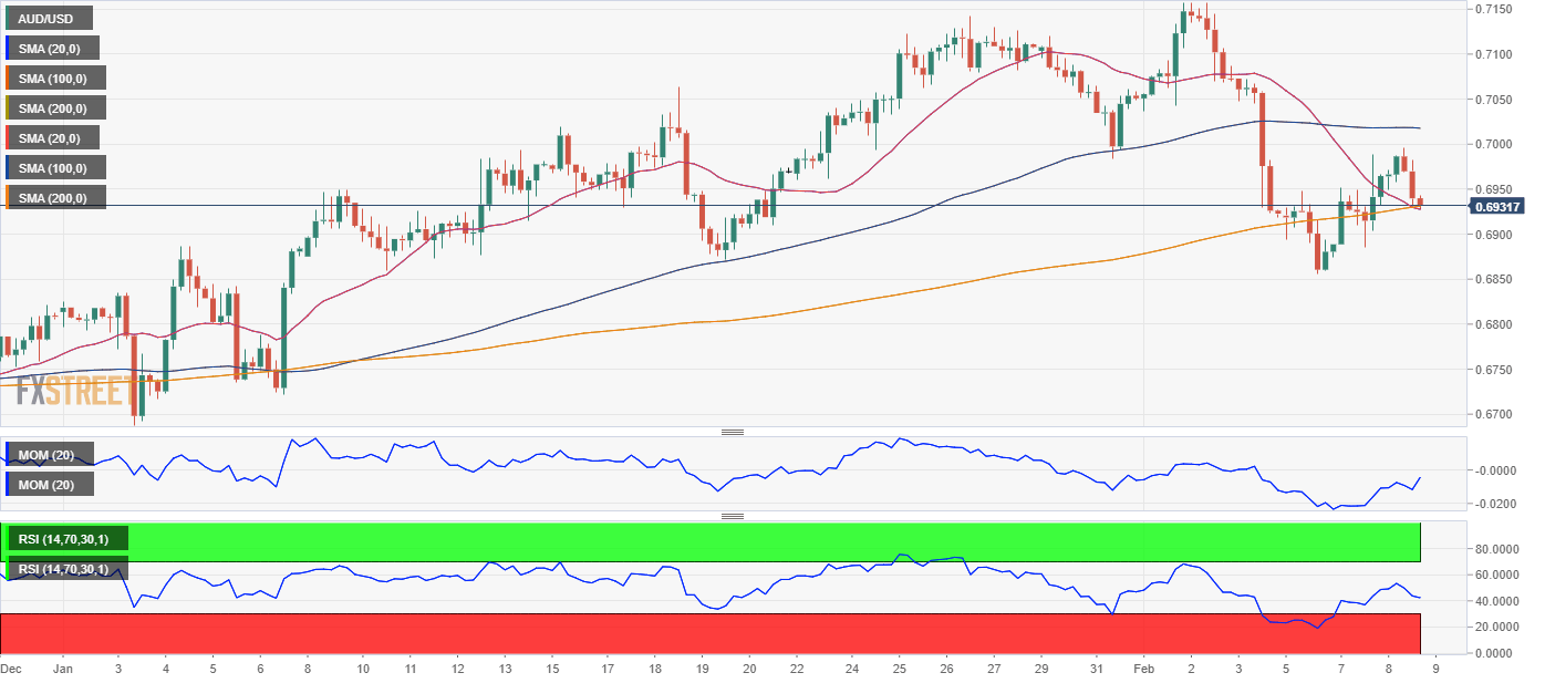 The pair is still neutral in the 4-hour chart, trading a handful of pips above a mildly bullish 200 SMA while hovering around a bearish 20 SMA. The Momentum indicator lacks directional strength above its midline, while the RSI indicator turned flat at around 42, skewing the risk to the downside. A break through 0.6900 should confirm a downward continuation on Thursday.