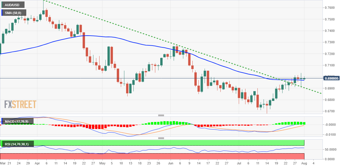 From a technical perspective, Friday's sharp intraday downfall stalled near a descending trend-line resistance breakpoint. The subsequent bounce and acceptance above the 50-day SMA favour bullish traders. Some follow-through buying beyond the 0.7000 psychological mark would reaffirm the positive outlook and pave the way for additional gains. The AUD/USD pair might then aim to surpass an intermediate hurdle near the 0.7060 region and aim to reclaim the 0.7100 mark. The momentum could lift spot prices beyond the 100-day SMA, around the 0.7115 area, towards testing the very important 200-day SMA, currently near the 0.7170 zone.