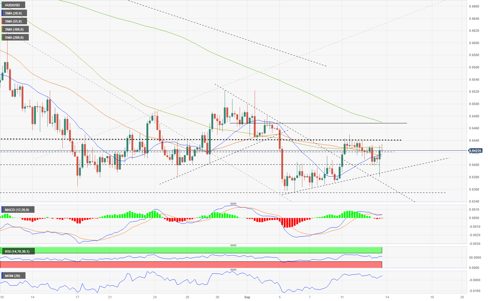 - The AUD/USD pair continues to hover around the 20-day SMA, staying above 0.6400.