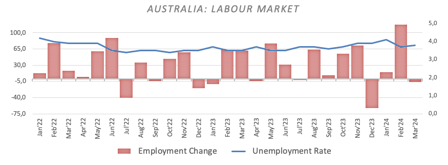 Regarding monetary policy, the Reserve Bank of Australia (RBA) reaffirmed its commitment to maintaining current policies in the minutes of its March meeting. Additionally, the market currently reflects a 90% likelihood of a 25 bps rate cut in 2024, compared to the nearly 50 bps of total easing observed earlier this month.