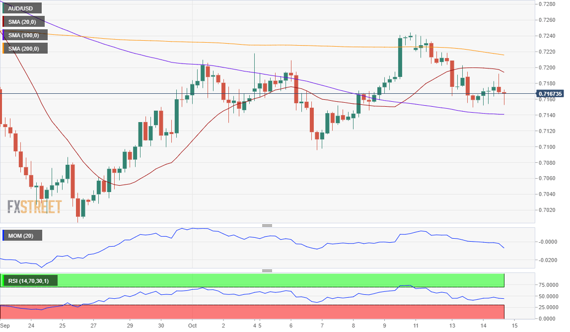 The AUD/USD pair is ending the day as it started around 0.7160, having spent it within a well-limited range. The pair advanced to 0.7190, but it changed course with Wall Street’s slump mid-US session. The Aussie remained subdued, despite Westpac Consumer Confidence resulted in 11.9% in October, better than the 9.9% forecast, although below the previous 18%.