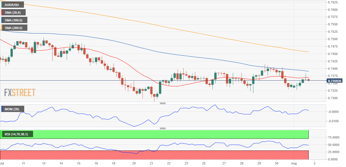 The AUD/USD pair posted a modest intraday advance on Monday, ending the day in the 0.7360 price zone. It peaked at 0.7381, later weighed by the poor performance of US equities. Absent demand for the greenback kept the downside in check. Higher gold prices helped limit slides, despite tepid Australian data released at the beginning of the day. Australian TD Securities Inflation improved from 0.4% to 0.5% MoM in July, while the annual reading printed at 2.6%. The AIG Performance of Manufacturing Index came in at 60.8 in July, down from 63.2 in the previous month.