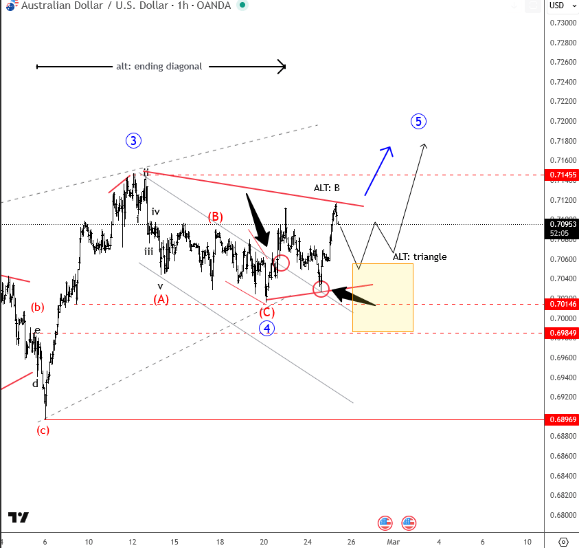 A three wave decline on AUD/USD from the recent high into the 0.7 support area, followed by a rebound out of the corrective channel and another push from the outside of that same channel, indicates that bulls are still here. So, we think that the whole pullback from the February highs is wave four, and sooner or later we can expect a new push higher, ideally wave five. The only question is whether this wave four is already finished, or if it could still be more complex, like a triangle.