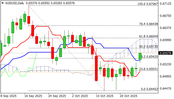 Bullish scenario requires penetration of daily cloud and rise above nearby 0.6573 Fibo barrier (50% retracement of 0.6706/0.6440) to strengthen near-term structure and open way for attack at next key barriers at 0.6600 zone (cloud top / Fibo 61.8%).