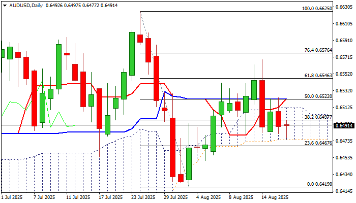 Upticks above cloud top (0.6512) were repeatedly capped by daily Kijun-sen (0.6522) that resulted in attack at cloud base (0.6474, also Fibo 61.8% of 0.6419/0.6568 upleg), which so far contained dips.