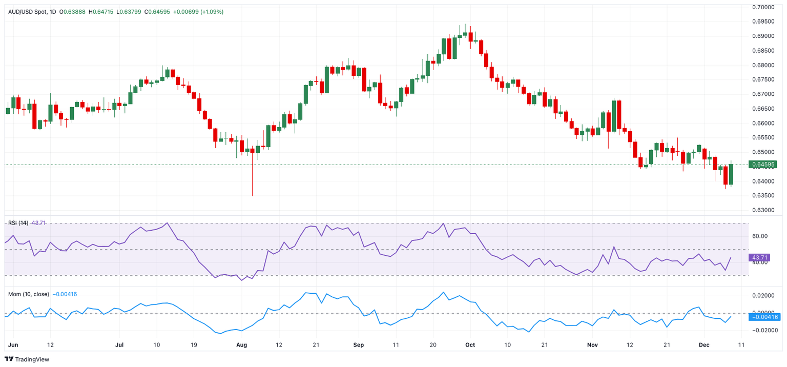 Immediate resistance sits at 0.6549, followed by the 200-day Simple Moving Average (SMA) at 0.6625 and November’s high of 0.6687. On the downside, initial support comes at 0.6399 (December’s low), with a deeper floor at 0.6347 (the August low for the year).