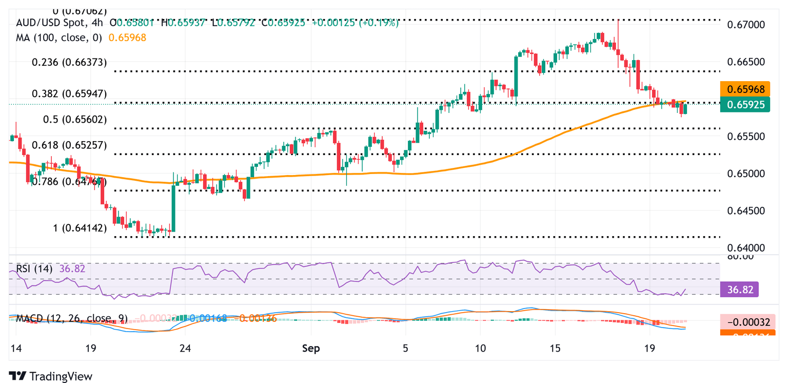 The AUD/USD pair now seems to have found acceptance below the 0.6600 mark, or the 38.2% Fibonacci retracement level of the recent move up from the August monthly swing low. The said handle coincides with the 100-period Simple Moving Average (SMA) on the 4-hour chart. However, oscillators on the daily chart – though have been losing traction – are holding in positive territory and warrant some caution for aggressive bearish traders. Nevertheless, spot prices still seem vulnerable to slide further towards testing the 50% Fibo. retracement level, around the 0.6560 region. Some follow-through selling would expose the 61.8% Fibo. retracement level, around the 0.6525 area, before the pair eventually drops to the 0.6500 psychological mark.