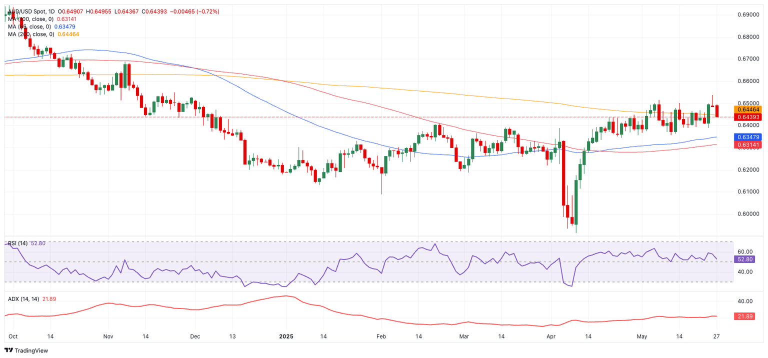 The 2025 high at 0.6537 (May 26), followed by the November 2024 high at 0.6687 (November 7) and the 2024 peak at 0.6942 (September 30), are the next important resistance levels.