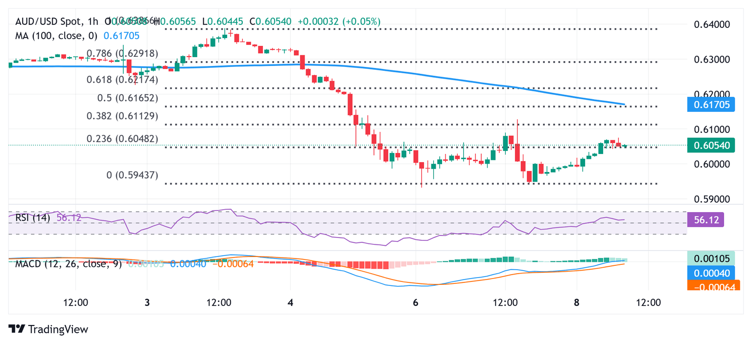 The AUD/USD pair builds on the previous day's late recovery from the 0.5930 area, or the lowest level since March 2020, and gains strong follow-through positive traction on Tuesday. The momentum lifts spot prices beyond mid-0.6000s during the first half of the European session and is sponsored by a combination of factors. Following the tariff-induced slump witnessed over the past three days, global equity markets registered strong gains amid reports that China is considering frontloading stimulus to mitigate the effects of US President Donald Trump's trade tariffs. This, in turn, offers some support to the perceived riskier Australian Dollar (AUD).