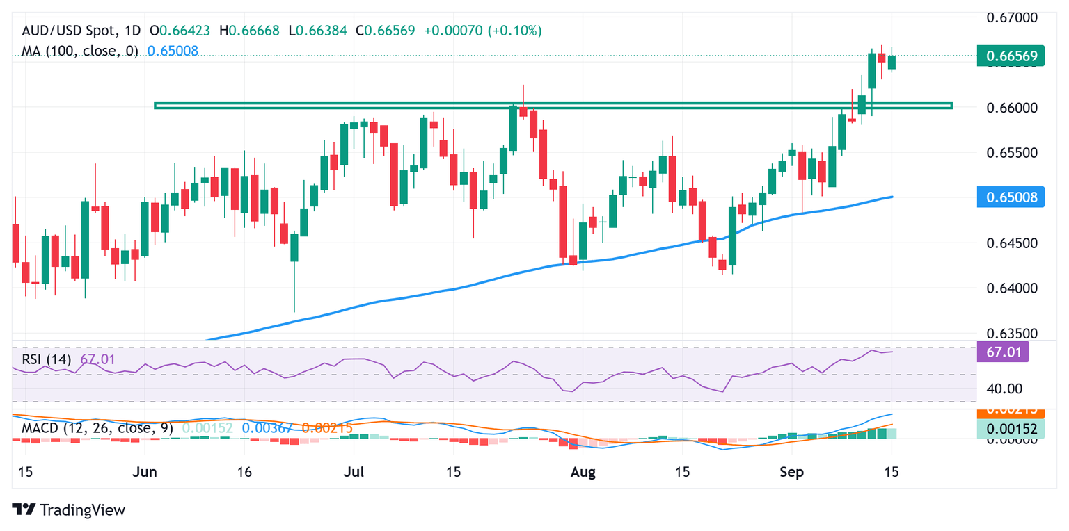 Meanwhile, the optimism remains supportive of the upbeat market mood and lends support to the China-proxy Australian Dollar (AUD). The USD, on the other hand, languishes near its lowest level since July 14 amid rising bets for a more aggressive policy easing by the Federal Reserve (Fed). Traders ramped up their bets for a Fed rate cut in September after the recent US macro data pointed to a softening labor market. Moreover, the Fed is expected to deliver two more rate cuts, in October and in December, which weighs on the USD and supports the AUD/USD pair.