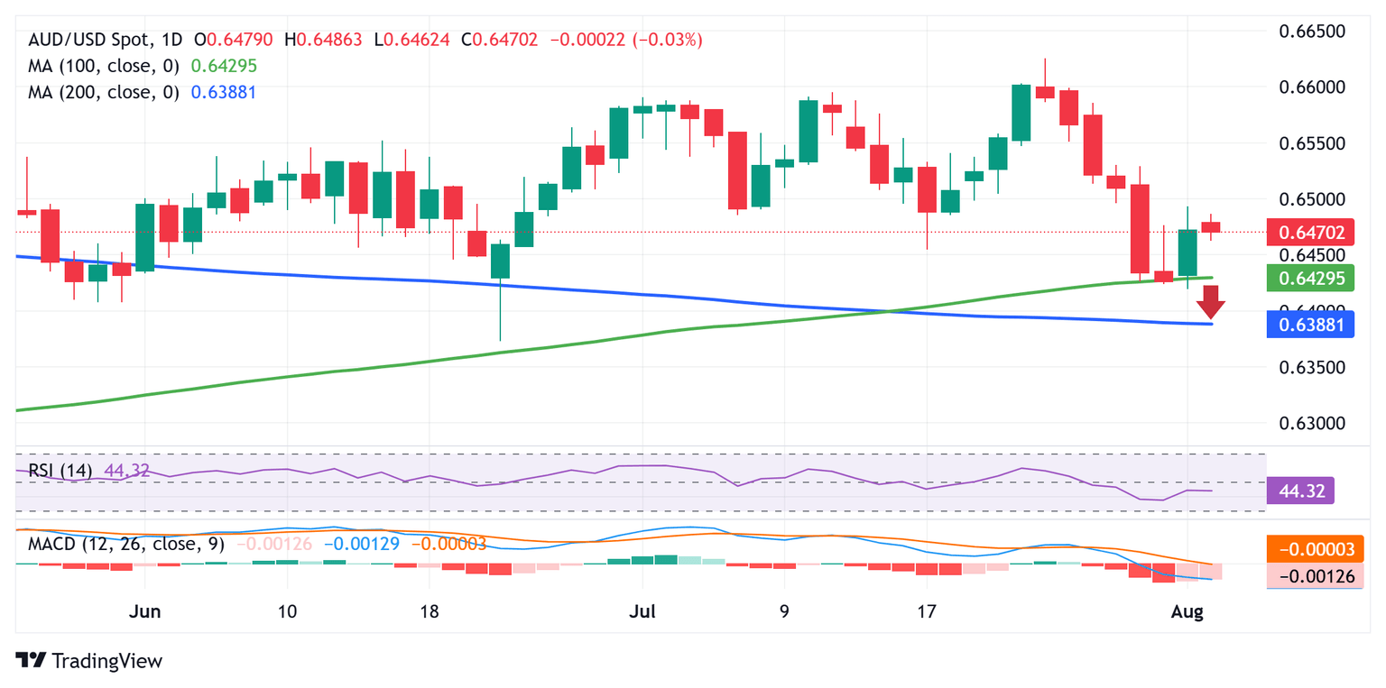 The AUD/USD pair struggles to capitalize on Friday's positive move and remains below the 0.6500 psychological mark through the first half of the European session on Monday, though it lacks bearish conviction. The Melbourne Institute's Monthly Inflation Gauge jumped 0.9% in July 2025, picking up sharply from a 0.1% rise in the previous month and marking the steepest increase since December 2023. This comes on top of the Reserve Bank of Australia's (RBA) caution about the inflation outlook, which, along with US President Donald Trump's decision to keep the minimum tariff rate of 10% for Australia, acts as a tailwind for the Aussie.
