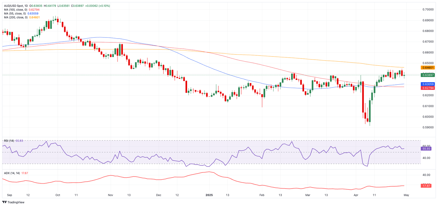 AUD/USD continues to trade below its 200-day simple moving average (SMA), now at 0.6462. A sustained break above this level would reinforce bullish momentum and bring the November 2024 high of 0.6687 into view.