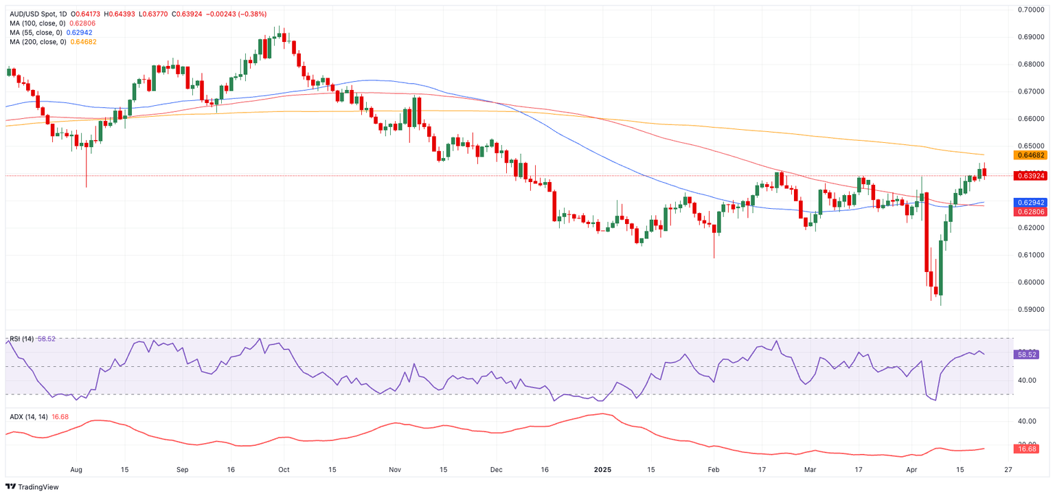 From a chart‑based perspective, the pair remains capped below its 200‑day simple moving average (SMA) at 0.6472. A convincing break above would first target the 2025 high at 0.6408 (February 21), then the November 7 2024 top of 0.6687.