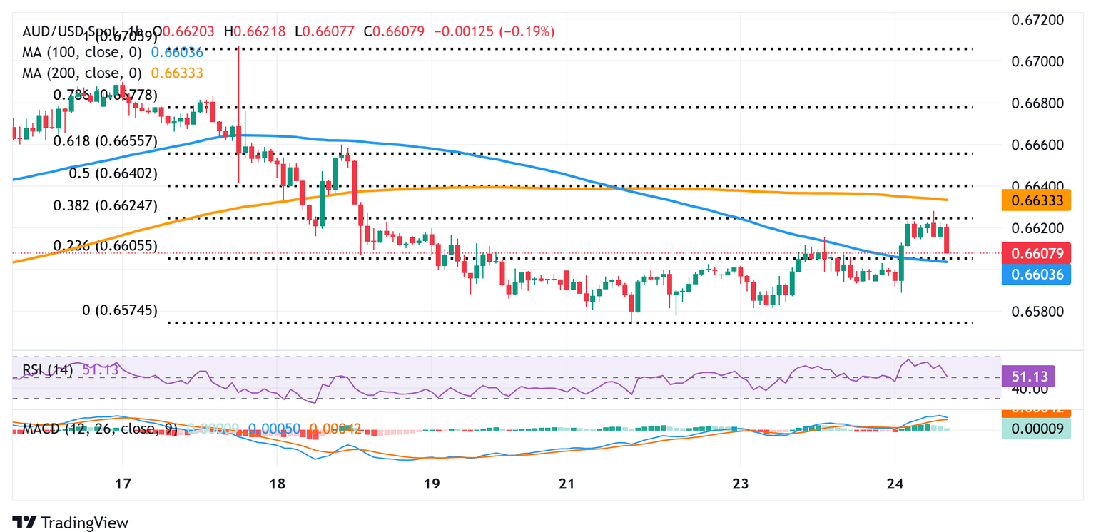 The intraday move beyond the 0.6600 confluence – comprising the 23.6% Fibonacci retracement level of the recent pullback from the year-to-date high and the 100-hour Simple Moving Average (SMA) – was seen as a key trigger for bullish traders. The subsequent move up, however, struggles to find acceptance above the 38.2% Fibo. level and falters near the 0.6625-0.6630 region. The latter nears the 200-hour SMA, which, if cleared, could lift the AUD/USD pair to the 0.6655 region, or the 61.8% Fibo. level. Some follow-through buying should allow spot prices to retest the YTD peak and make a fresh attempt to conquer the 0.6700 round figure.