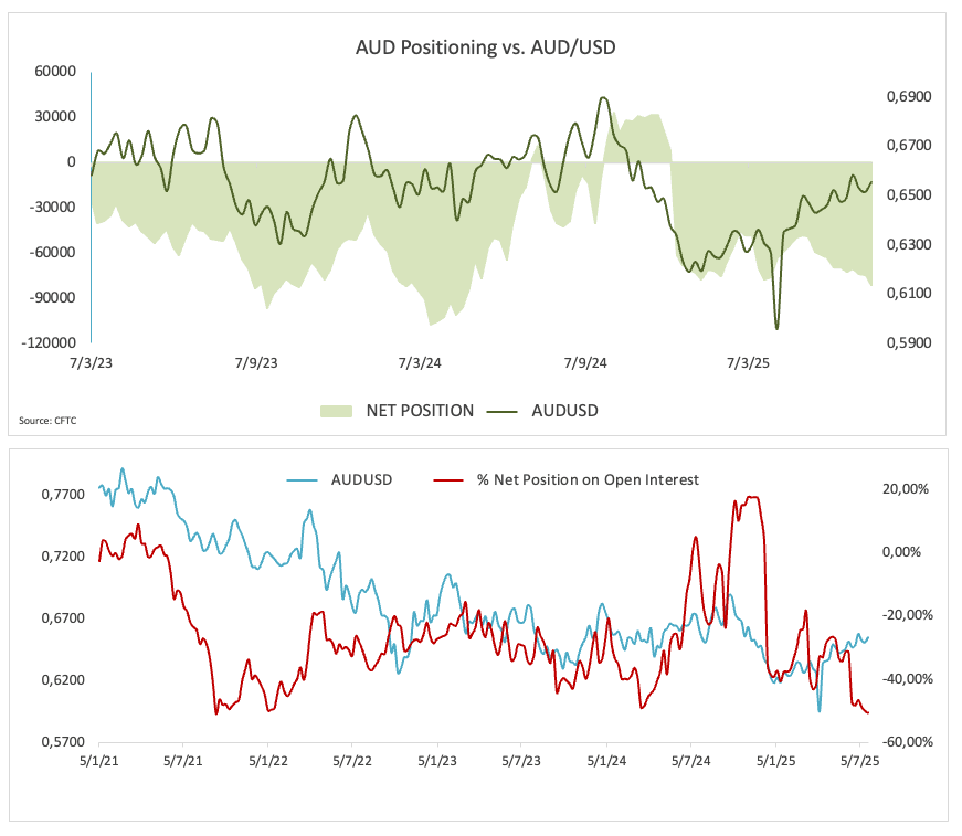 “Fast‑money” traders have turned even more cautious on the Aussie, boosting their net short positions to about 81.2K contracts—their most bearish stance since April 2024. Meanwhile, total open interest has swelled to roughly 161.4K contracts, marking a multi‑week high.