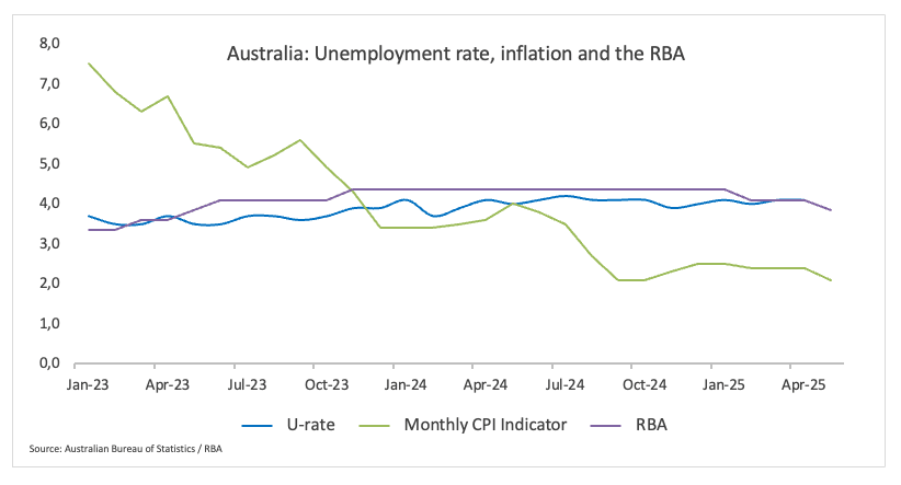 Australia’s Monthly CPI Indicator came in at 2.1% in May, down from 2.4% in the previous month and hitting the lowest level so far this year. The measure remains within the RBA’s 2%-3% target, despite the bank is expected to remain laser-focused on developments in the labour market.