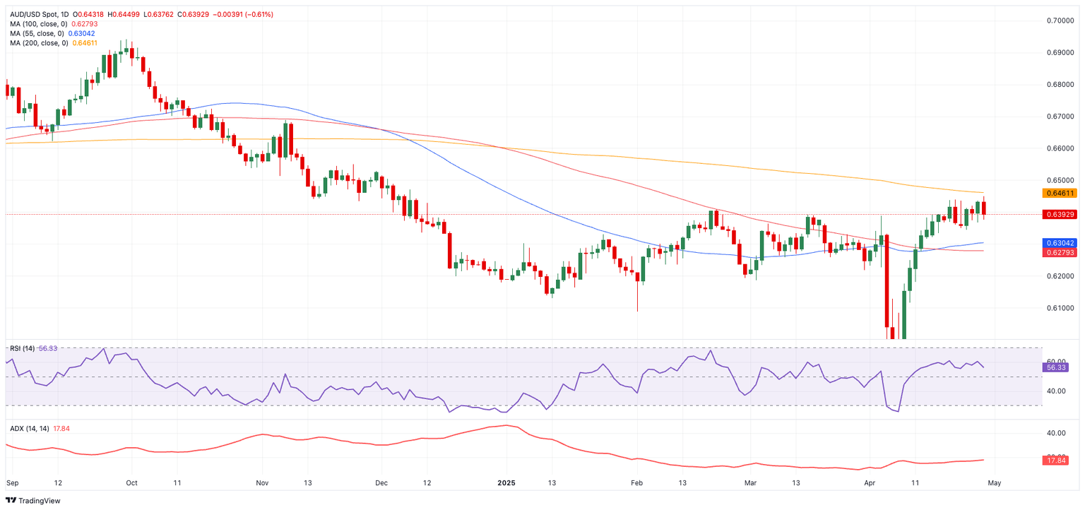 AUD/USD remains capped below its 200-day simple moving average (SMA), currently at 0.6464. A decisive break above that threshold could signal a more bullish near-term outlook and would put the November 2024 peak of 0.6687 back on the radar.