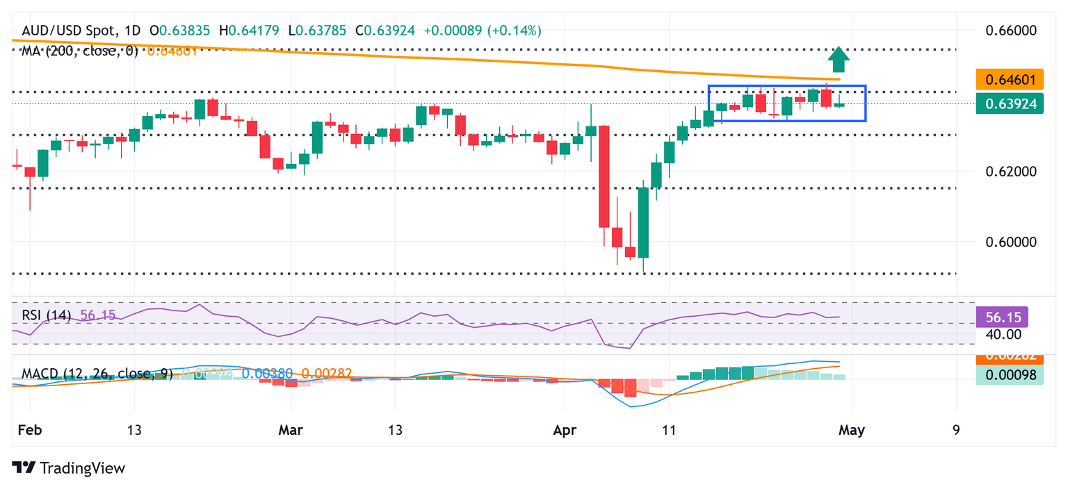 The range-bound price action might be categorized as a bullish consolidation phase against the backdrop of the AUD/USD pair's recent sharp recovery from the 0.5900 neighborhood, or a five-year low touched earlier last week. Moreover, the recent breakout above the 100-day Simple Moving Average (SMA) – for the first time since October 2024 – and positive oscillators on the daily chart validate the positive outlook. That said, repeated failures near the 50% Fibonacci retracement level of the September 2024-April 2025 downfall make it prudent for bulls to wait for some follow-through buying beyond the overnight swing high, around mid-0.6400s, before placing fresh bets.