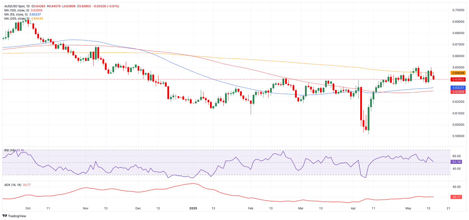 Clearing the key 200-day SMA near 0.6460 would improve the near-term outlook for AUD/USD, with resistance levels to watch at 0.6514 (2025 high from May 7) and 0.6687 (November 2024 high).