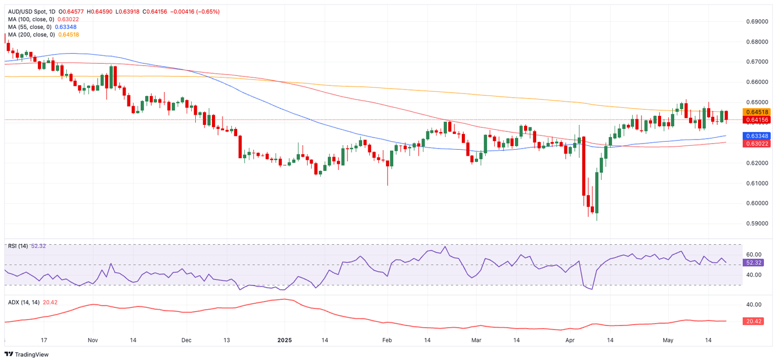 Technically, AUD/USD must clear its 200-day simple moving average (SMA) at 0.6454 to sustain its upward momentum. A break above this region could pave the way for a retest of the YTD high at 0.6514 (May 7), with further gains targeting the November 2024 top at 0.6687.