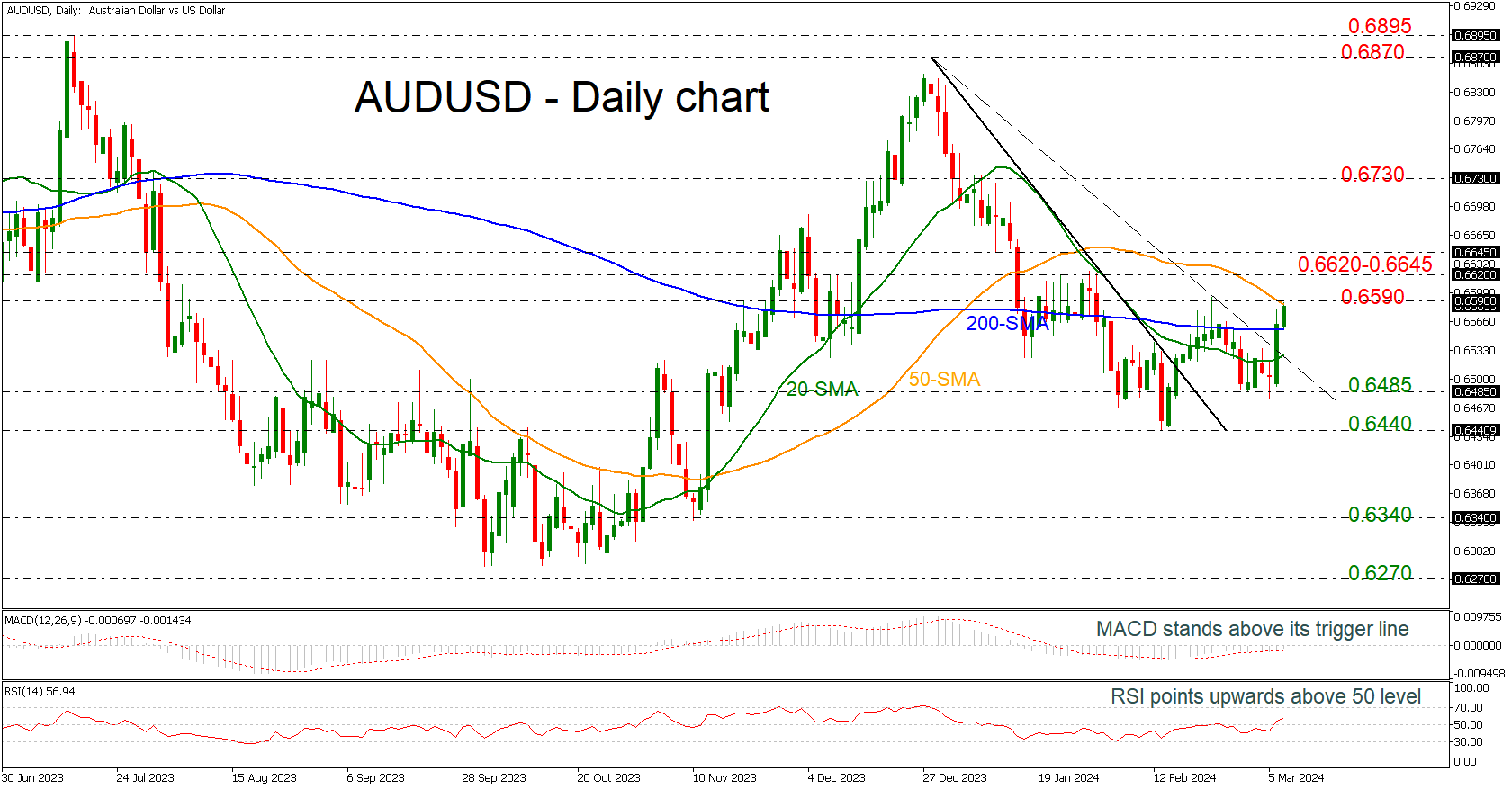 AUD/USD has been experiencing a new up leg over the last couple of days, surpassing above the short-term downtrend line and the flat 200-day simple moving average (SMA), meeting the 50-day SMA near the 0.6590 critical resistance.