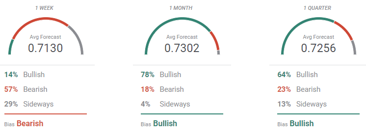 The FXStreet Forecast Poll points at a near-term leg lower before a recovery finally takes place. On average, the pair is seen at 0.7130 next week and around 0.7300 in a month. Bears lead the way in the weekly perspective, while bulls jumped to 78% in the monthly view and bears decline to 18%. The positive momentum eases as time goes by, as the quarterly perspective has an average target of 0.7256.