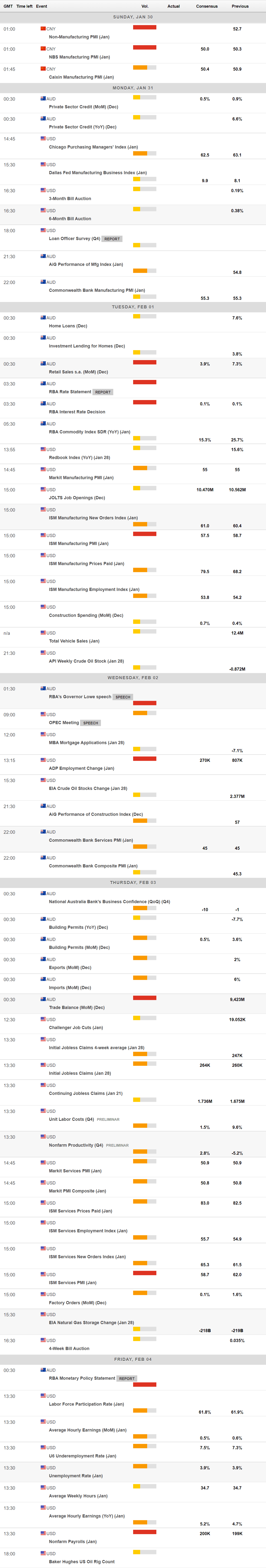 Australia will release through the week the January AIG Performance of Manufacturing Index, December Retail Sales, Q4 NAB's Business Confidence, and the December Retail Sale. The Reserve Bank of Australia will have a monetary policy meeting next Tuesday, although the central bank is expected to maintain its current policy on hold.