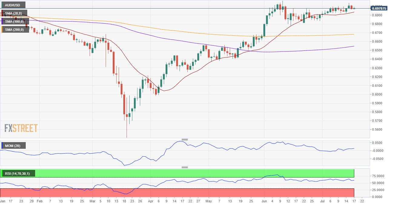 The technical picture for the AUD/USD pair has not changed much. The weekly chart shows that the pair holds above a mildly bearish 100 SMA, which provides dynamic support around 0.6900. The 20 DMA has turned marginally higher far below the current level, while the 200 SMA maintains its bearish slope around 0.7270. The Momentum indicator eased from overbought levels, still well into positive ground, as the RSI indicator consolidates around 60. All of these suggest that bears are nowhere to be found, and while bulls may be reluctant to push the pair beyond 0.7000, the risk is still skewed to the upside.