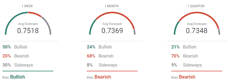 The FXStreet Forecast Poll shows that market participants are betting on another leg north in the near term, as 50% of the polled experts are bullish, with an average target of 0.7518. The monthly and quarterly perspectives indicate that sellers outpace buyers, with the pair seen on average below the 0.7400 mark.