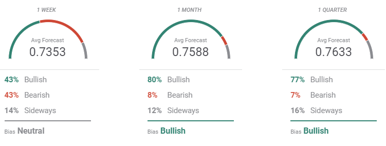 The FXStreet Forecast Poll shows that the pair may be close to an interim bottom. The sentiment is neutral in the weekly perspective and shifts to bullish for the next weeks. Those looking for higher levels account for 80% in the monthly view, and 77% in the quarterly one with the pair seen on average at 0.7588 and 0.7633 respectively.