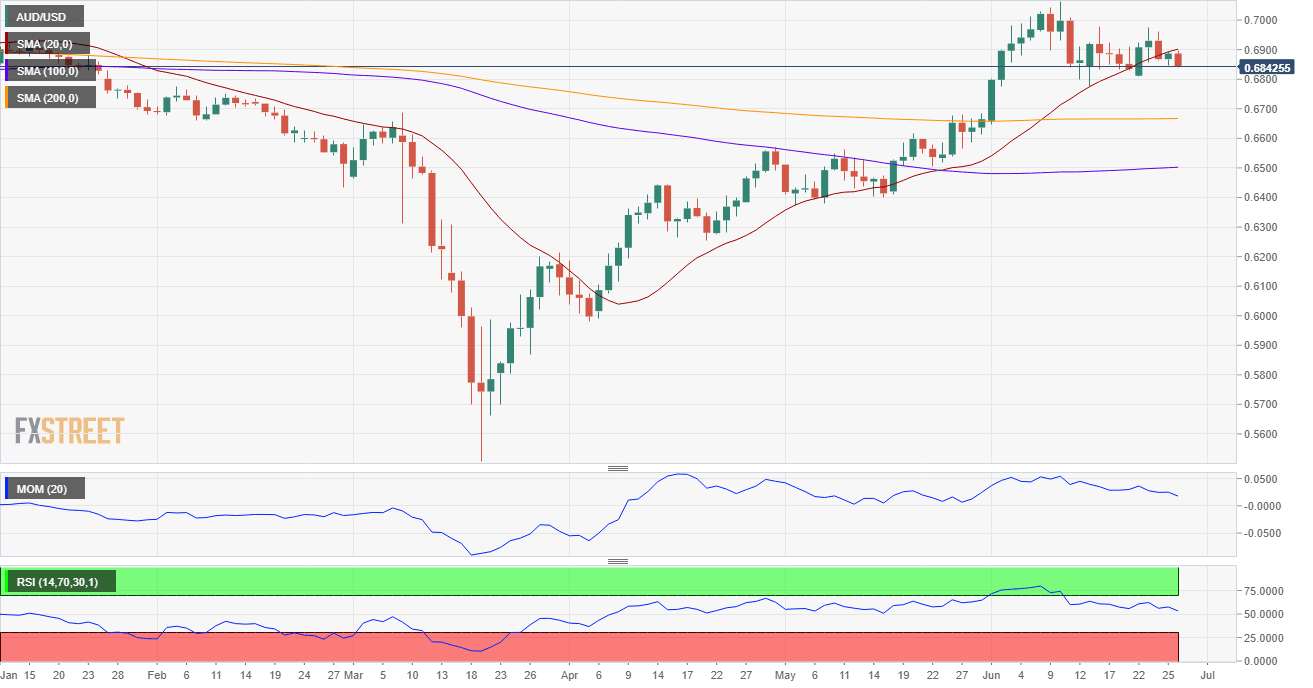The AUD/USD pair is below a bearish 100 SMA in the weekly chart, unable to surpass it since June started. Still, the pair remains above a mild-bullish 20 SMA, as technical indicators hold within positive levels, keeping the risk skewed to the upside.