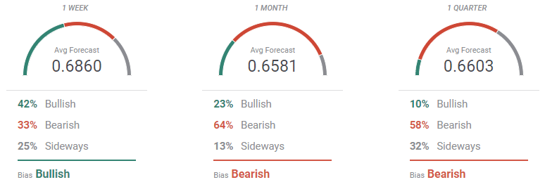 The FXStreet Forecast Poll indicates that market players are betting against the greenback in the short-term, although it favors the American currency in the longer-term perspectives. Banks seem to be the most bearish, seeing the pair below 0.6000, which drags the average lower. However, bears are a majority, with bulls accounting for 23% of the polled experts in the monthly view, and just 10% for the quarterly perspective. Weird enough, just a few traders expect the pair to run beyond 0.7000 in the upcoming weeks.