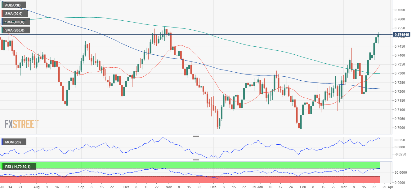 - AUD/USD is technically bullish and could soon run beyond 0.7600.