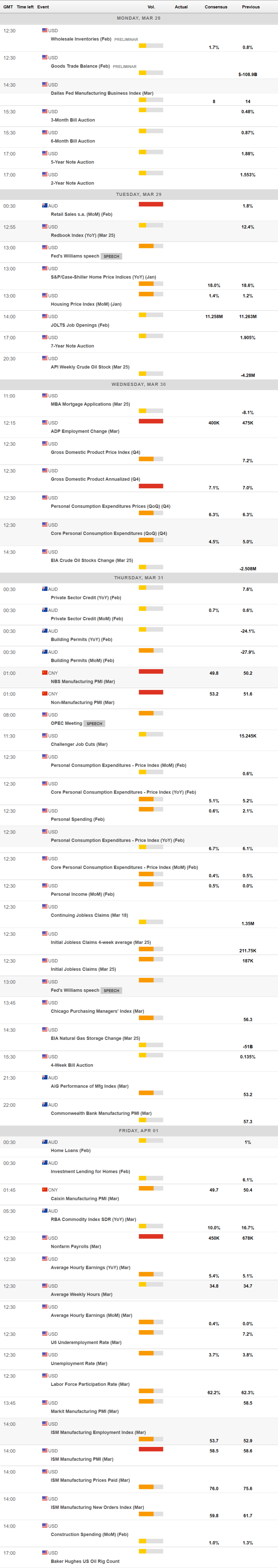 Australian data failed to impress. The March Commonwealth Bank PMIs came in worse than anticipated, according to preliminary estimates, but remained in expansionary territory. In the US, February Durable Goods Orders were down 2.2%, much worse than the -0.5% expected. The preliminary Markit estimates of the US March PMIs were upbeat, while Initial Jobless Claims for the week ended March 18 shrank to 187K, beating expectations. Finally, the March Michigan Consumer Sentiment Index was confirmed at 59.4.