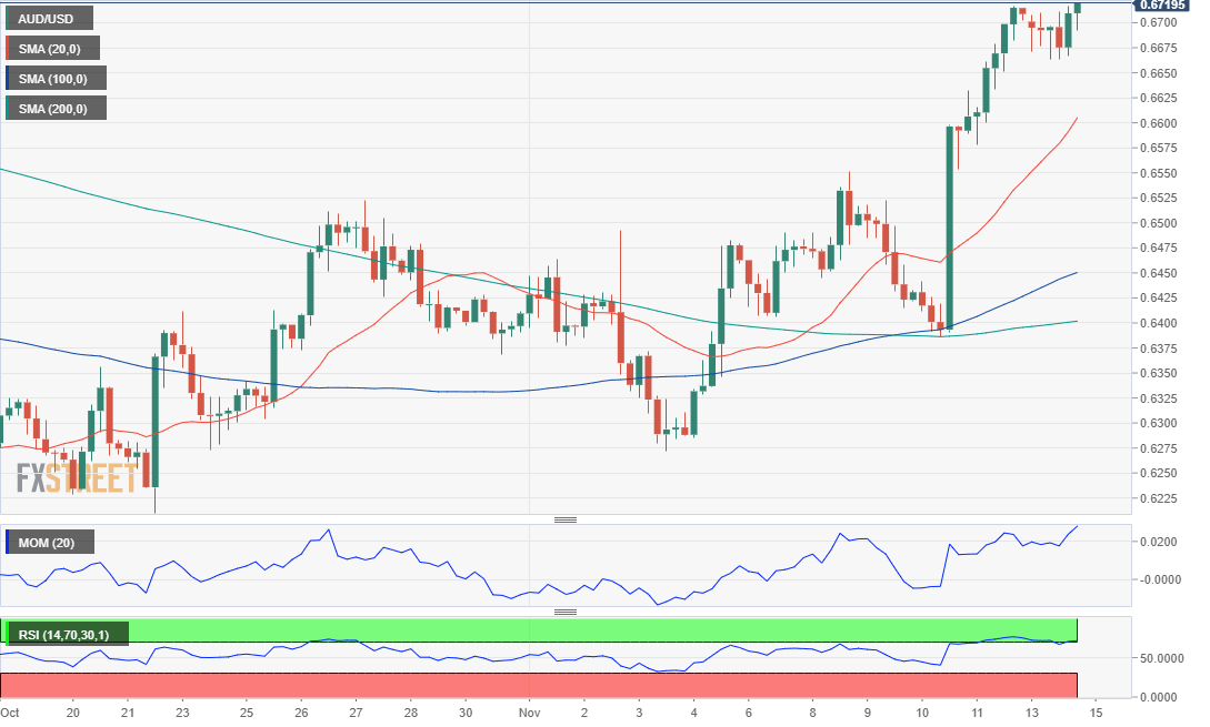 The AUDUSD pair is ending Monday with modest gains in the 0.6710 price zone, pressuring a fresh November monthly high. The pair slid throughout the first half of the day amid US Dollar near-term oversold conditions. Nevertheless, speculative interest saw it as a chance to short further the greenback, which somehow anticipates how things will go, at least until the next US Federal Reserve (Fed) meeting in a month. Hawkish comments from Fed officials may be ignored by market players unless Chief Jerome Powell explicitly says that December will bring a 75 bps rate hike.