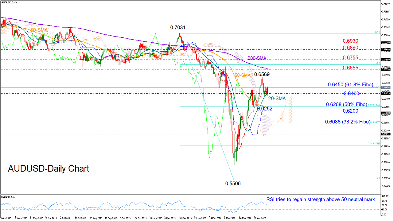 AUDUSD nicely landed on the 20-day simple moving average (SMA) following its pullback from a peak of 0.6569 on April 30.