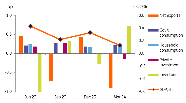 Private fixed investment was a more obvious culprit for the slowdown in the latest quarter. Investment provided no boost to growth in 4Q23 and deteriorated to a 0.2pp drag this quarter.
