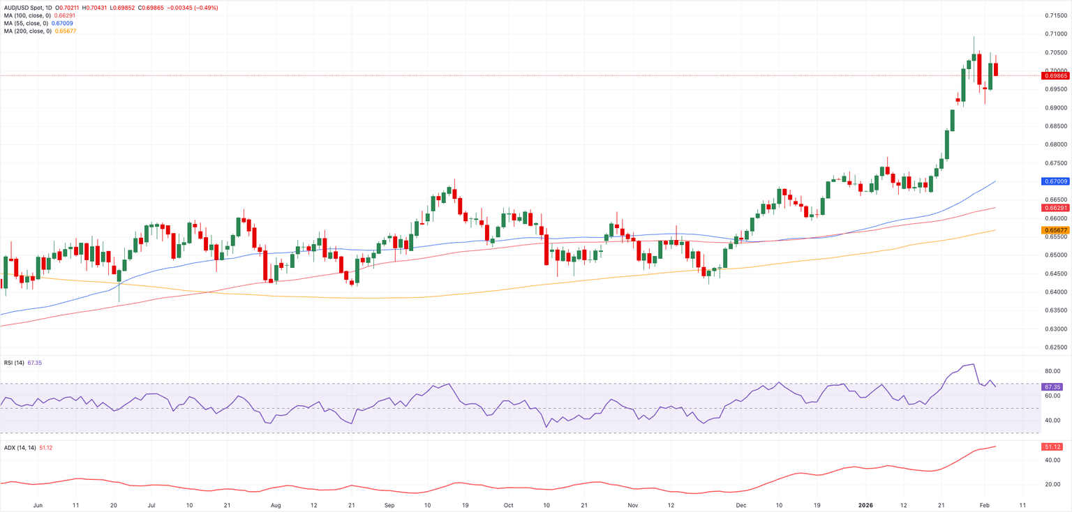In case bulls push harder, AUD/USD should meet its next up barrier at the 2026 ceiling at 0.7093 (January 29) before the 2023 high at 0.7157 (February 2).