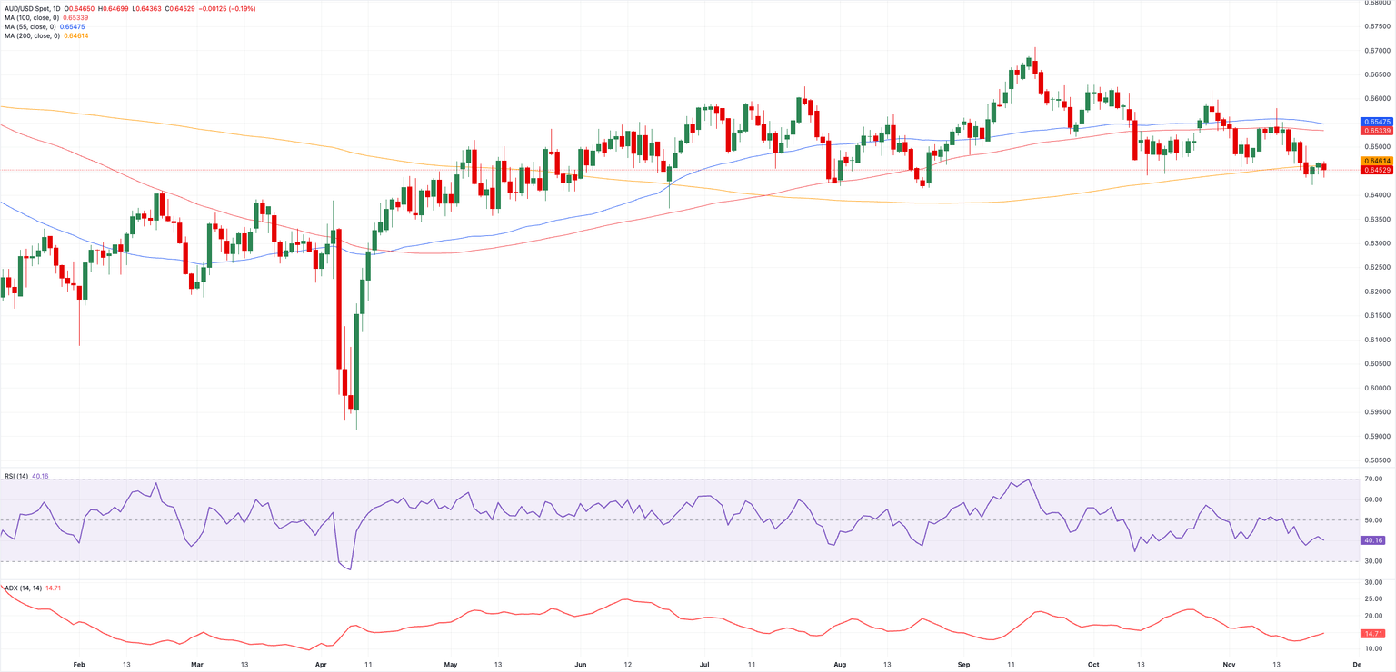 The Australian Dollar (AUD) is on the back foot again, giving up some of the early-week optimism. That pullback has pushed AUD/USD back below its key 200-day SMA near 0.6460, wiping out two straight days of gains.