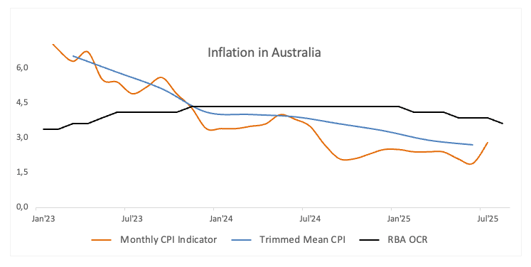 July’s Monthly CPI Indicator (Weighted Mean) jumped to 2.8%, up from 1.9% the month before. Q2 CPI climbed 0.7% QoQ and 2.1% YoY, keeping price pressures in focus and reinforcing the Reserve Bank of Australia’s (RBA) cautious tone.