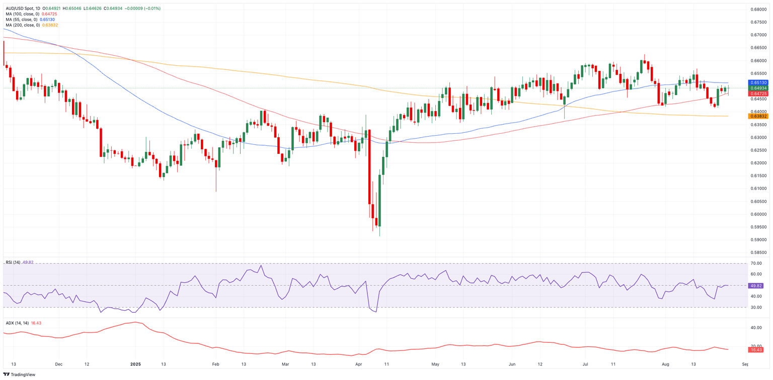On the downside, support is holding for now at 0.6414 (August 21). A break lower would bring the 200-day Simple Moving Average (SMA) at 0.6384 into view, followed closely by the June floor at 0.6372 (June 23).