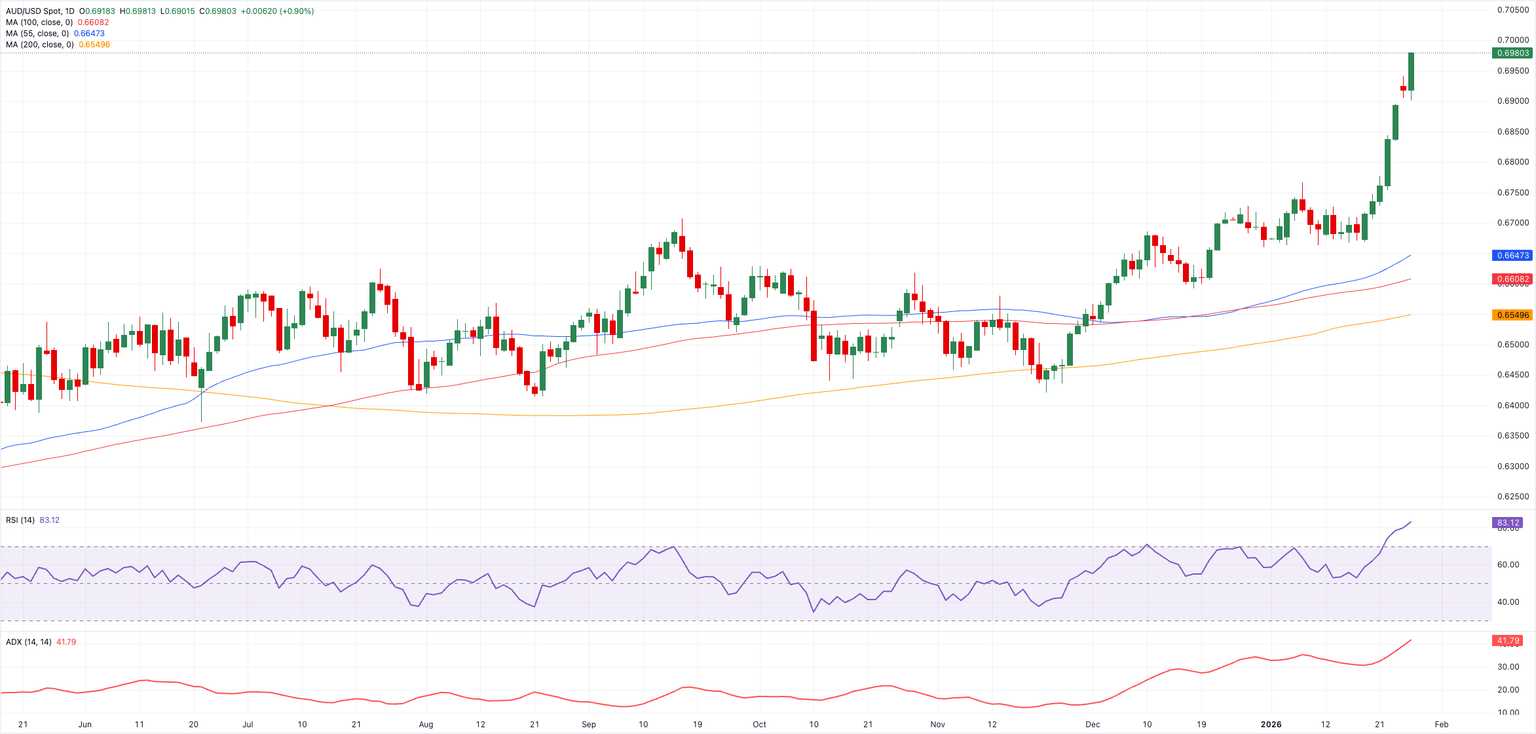 The Australian Dollar (AUD) extends its strong leg higher on turnaround Tuesday, lifting AUD/USD near the 0.7000 milestome for the first time since February 2023, up for the seventh consecutive day.